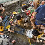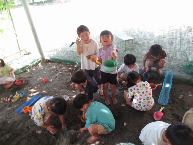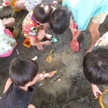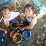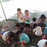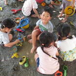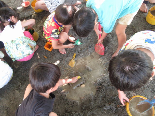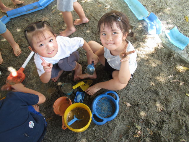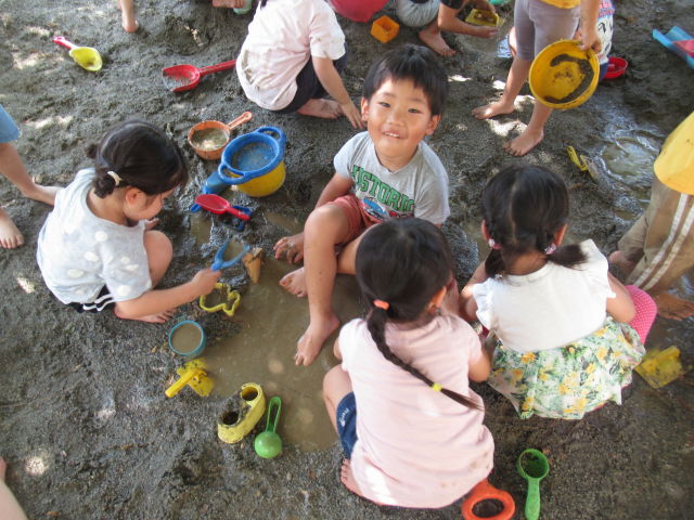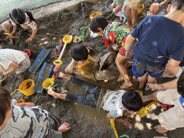 とっても楽しみにしていた泥んこ遊びをしました。まずは裸足で砂の上を歩いてみます。「冷たいね♡」「ざらざらしてる!」と普段感じることのできない感触を楽しんでいました。水を流しドロドロになると「チョコレートみたい♡」「温泉作るぞ!」とお友だちと協力しながら深い穴を掘ったりお店屋さんが開店したりしているところもありました。普段なかなかできない泥んこ遊びを全身で楽しんでいる子ども達でした。