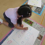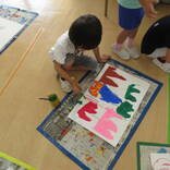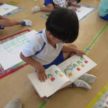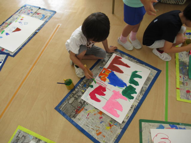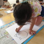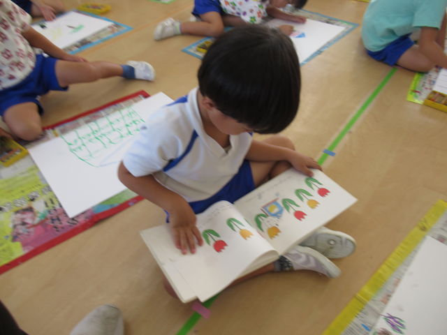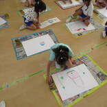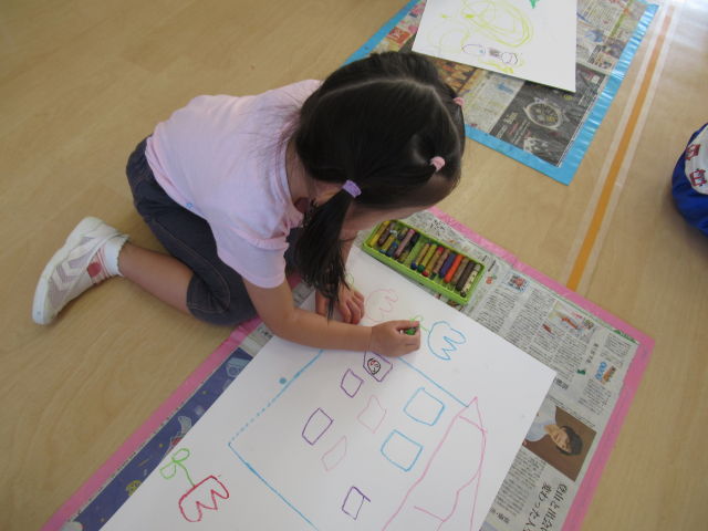 いけ組は『ねこのピート』の絵本を題材にすることに♪ねこのピートが真っ白な靴を履いて散歩をしているといちごの道、ブルーベリーの道・・・などの道が。その道の上を歩く事で靴の色がどんどん変化していくというお話です。まずはねこに変身★「ねこの足は何本?」「しっぽはどこについている?」とみんなで確認しました。ねこについて考えた後は「私はいちごの道にする」「僕は桃にする!」などと自分で決め、とっても楽しそうに描いていました。