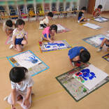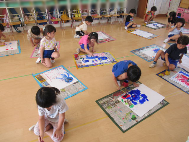 絵画の先生から「そらいろのたね」が配られると「どこに種を植えようかな♡」と思い思いの場所に種を植えていました。種を植えると、「たくさん動物が遊べるお家にする!」「お花は何色にしようかな」と絵本の世界観をどんどん広げながら絵画を楽しんでいました。