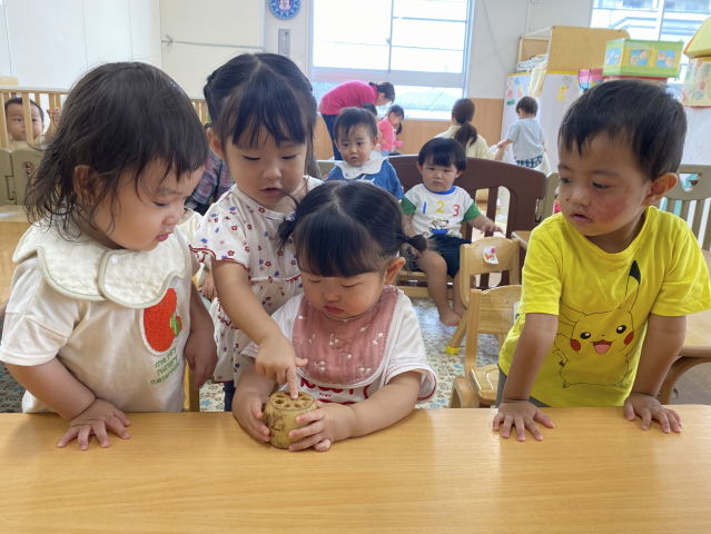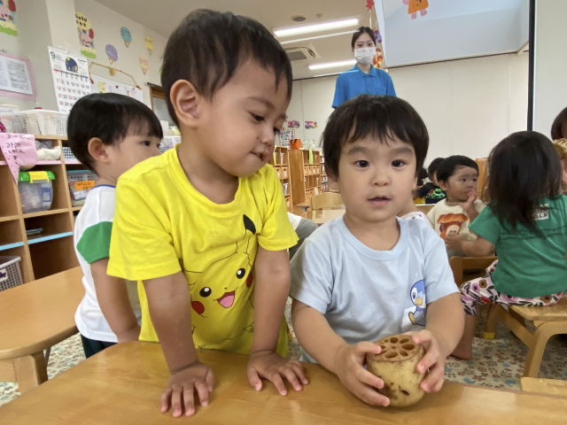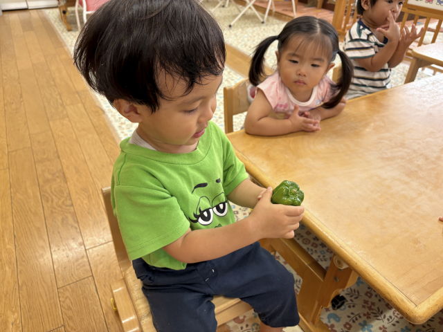 少しずつ涼しくなり、秋の気配が感じられるようになってきましたね。秋といえば…食欲の秋!ということで、たまご組では「食育あそび」を楽しみました♪まずは、「りんごころころ」の手あそびや絵カードでスタート!「キャベツがキャー!」と体を大きく動かしたり、「ピーマン!」と元気に教えてくれる姿が見られましたよ♪そして本物の野菜や果物が登場すると、「りんご!」「みどり!」と、知っている名前や色を元気いっぱいに教えてくれました。1学期に育てたピーマンには、特に興味をもっていました♪