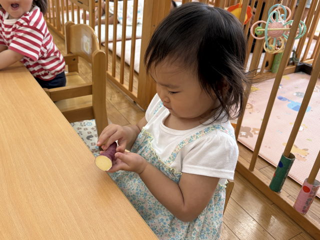 じっくり観察したあとは、食材をチョッキン!順番に触ったり、顔を近づけて匂いをかいだり、、、五感をたっぷり使って楽しみました!にんじんの匂いに「くさい〜」と言う子や思わず口をつけて皮の苦さにびっくりする子、キャベツの重さに驚く子など、さまざまな反応があり、新しい発見がいっぱいの様子でした♪