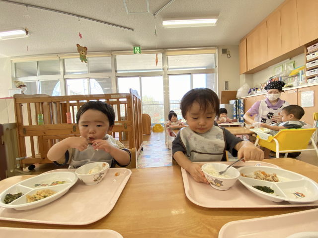 給食の時間には、「ピーマン!」「おなじ!」と名前を教えてくれる姿や1口食べるチャレンジをする姿が見られました。遊びの体験が、食への関心へとつながっていることを感じ、とても嬉しく思います。最近では、スプーンやフォークなどの食具も、少しずつ上手に使えるようになってきています!「みて〜!」と嬉しそうに見せてくれる姿や、友だちのまねをしながら一緒にがんばる姿がとてもかわいらしいです♡持ち方や口への運び方を一緒に確認しながら、できたときにはたくさん褒めて、自信につなげています。おうちでもぜひ、楽しく練習してみてくださいね♪