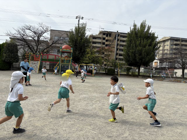 少しづつ気温も下がり、外で遊べる日が増えてきました。戸外遊びも大好きな年長組のお友達。いつも鬼ごっこをする4,5人のグループが何組かあり「じゃあ、一緒にやろう!」と、みんなで集まってすることになりました。
