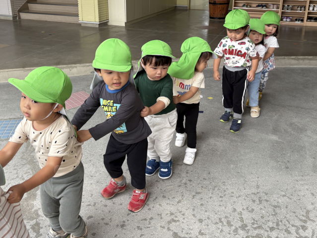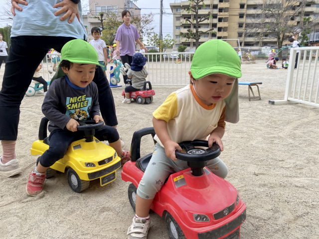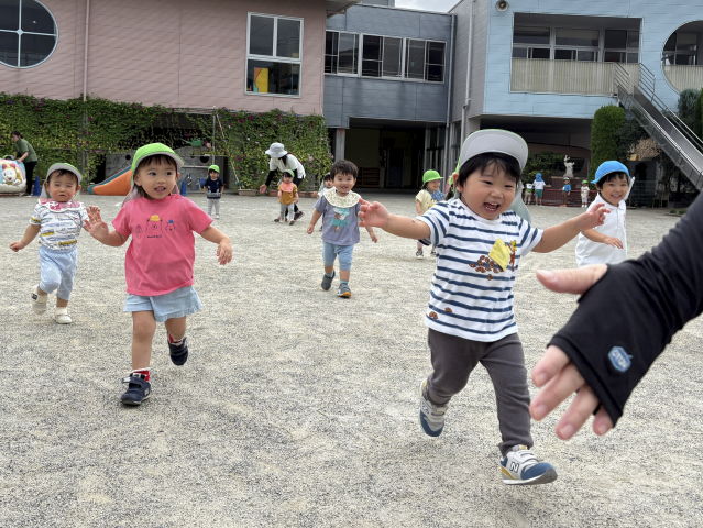 準備が整ったら、「手をつなごう〜♪」とみんなで輪になり、歌を歌いながら準備体操をします。一生懸命に歌ったり、体を動かしたり、友だちに手をつなごうと誘ったりする姿はとても微笑ましいです♡いよいよ、電車ごっこのように友だちの後ろについて、園庭へ出発!「新幹線でゴーゴーゴー♪」と元気に歌いながら、上手に歩いています。園庭に着くと、まずは一列に並んでかけっこをします!名前を呼ぶと元気よく手を挙げて「はーい!」とお返事♪「よーい、ドン!」の合図で腕を振って一生懸命に走る姿は、にこにこ笑顔だったり、真剣な表情だったり…どの姿も本当にかわいらしいです♡かけっこのあとは、すべり台、砂場、車の乗り物など、それぞれ好きな遊びを楽しみました。これからも安全に配慮しながら、体を思いきり動かして遊んでいきたいと思います!