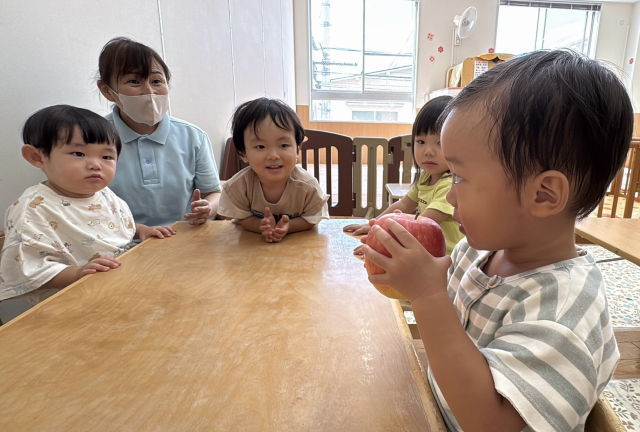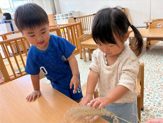 10月6日は十五夜でした。たまご組では、お月見の絵本を読んだり、ススキや秋の食べ物に触れたりして、季節の行事を楽しみました。絵本や先生の話をよく聞いて理解していたようで、「おつきさま」「フワフワ」など、子どもたちなりに感じたことを言葉にして楽しむ姿が見られました。「今日はおつきさま見えるかな〜?」と、空を見上げて楽しみにする姿もとても可愛らしかったです♡これからも、子どもたちが季節を感じられるような活動を取り入れながら、一緒に楽しい秋を過ごしていきたいと思います。