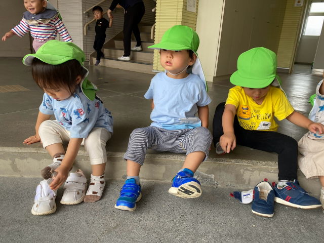 靴下と帽子の準備ができたら、階段を降りて下駄箱へ向かいます。手すりや先生の手をしっかり握って「いち、に!いち、に!」と声をかけながら、ゆっくりと降りていきます。日々の積み重ねで、スムーズに降りられるようになってきましたよ♪下駄箱に着いたら、自分の靴を取り、座って靴を履きます。マジックテープを剥がすことはできるようになってきており、今は、足を入れてから自分でとめる練習をがんばっています。