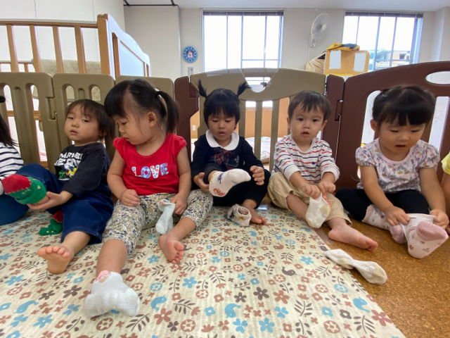 まずは靴下を履いて、帽子をかぶります!自分でカゴから靴下を取って、両手を使いながら一生懸命履こうとする子どもたち。中には「やって〜」と靴下や帽子を先生に渡してお願いする姿も見られます。先生たちは「がんばれ〜!」「ここを引っ張ってみよう」と優しく声をかけながら、必要に応じてお手伝いし、子どもたちが“自分でできた!”という達成感を味わえるように関わっています。