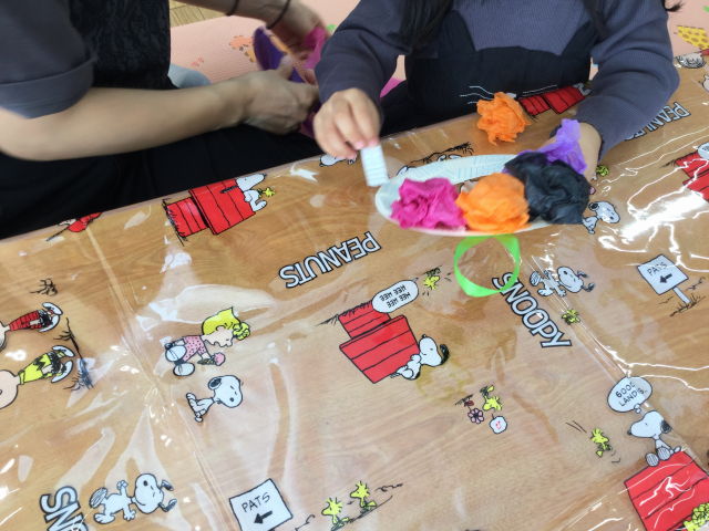 ピンク・オレンジ・黒・紫・薄紫のお花紙を自由に選んで丸めて紙皿に貼り付けました♪