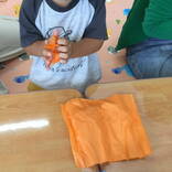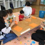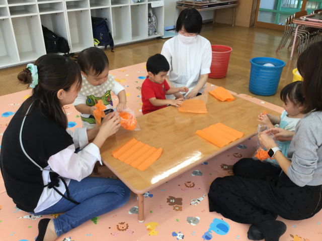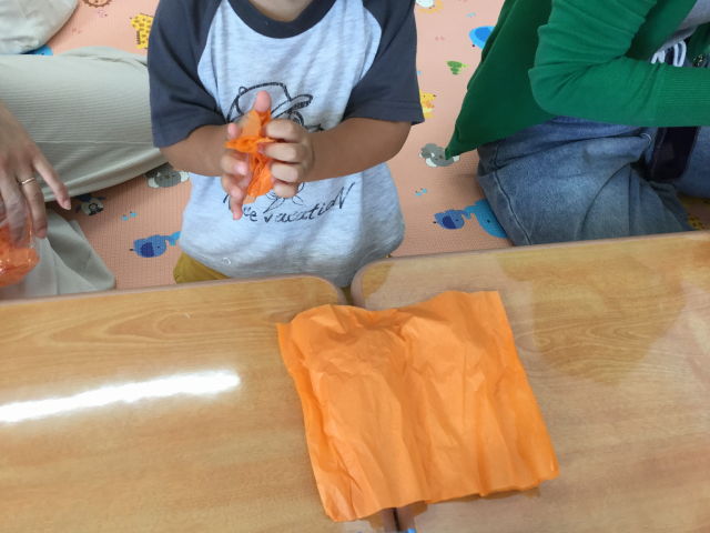 うさぎ組ではオレンジのお花紙を丸め、ビニール袋に入れたら目と鼻をつけてカボチャのおばけを作りました!