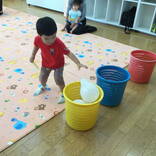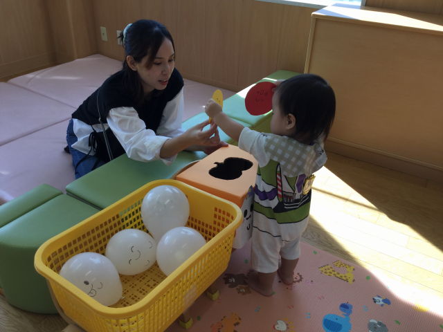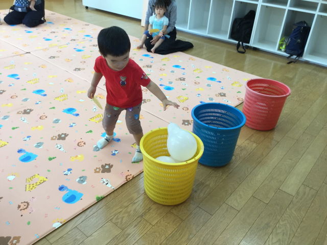 風船おばけゲームでは、箱の中から引いた色と同じ色のカゴに風船おばけを入れてあげました。