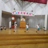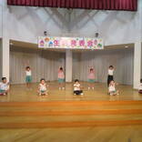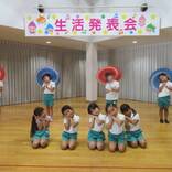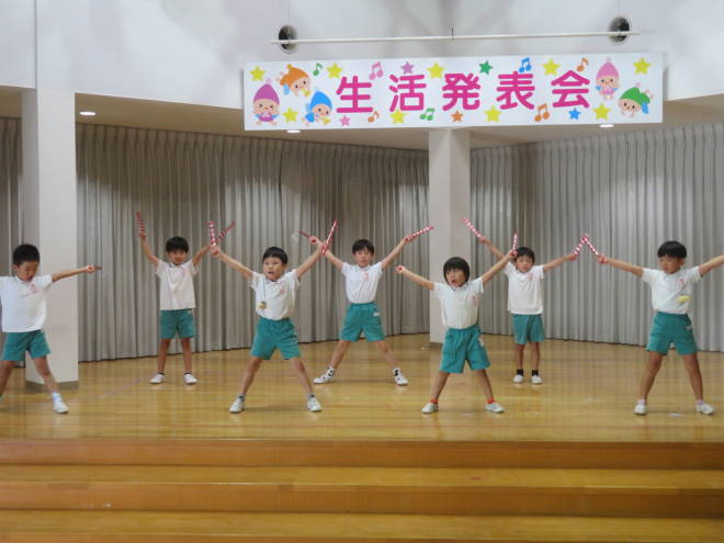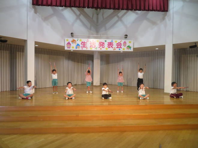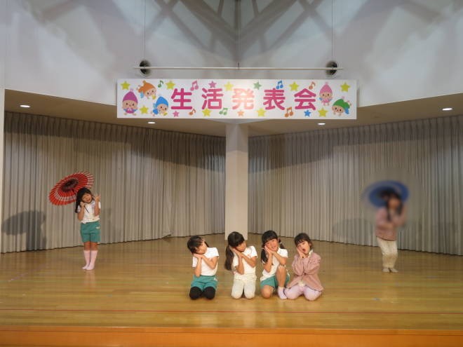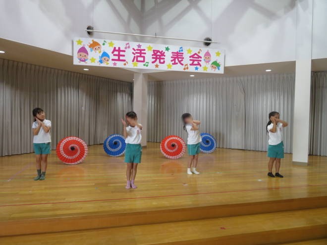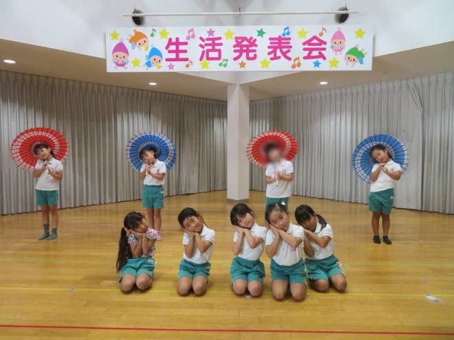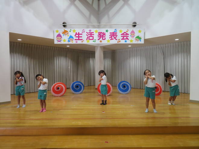 年長組は、傘を使った着物のダンス、バチを持った法被のダンスを踊ります。