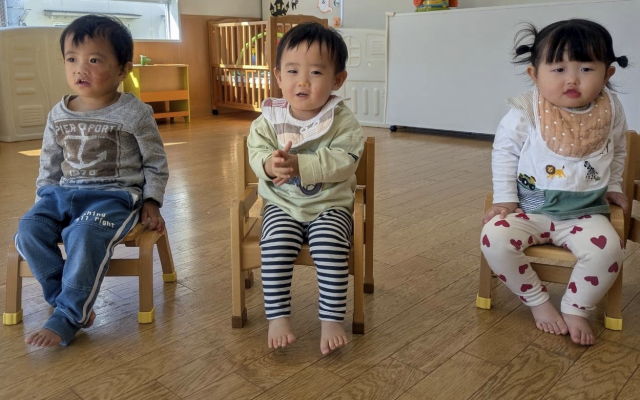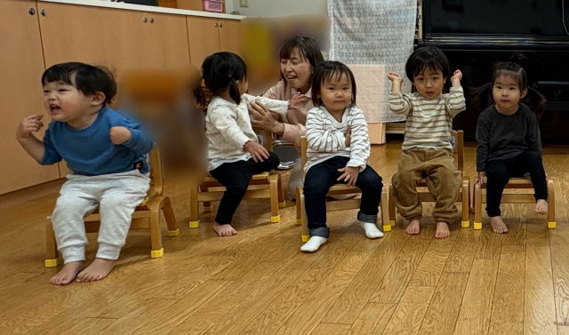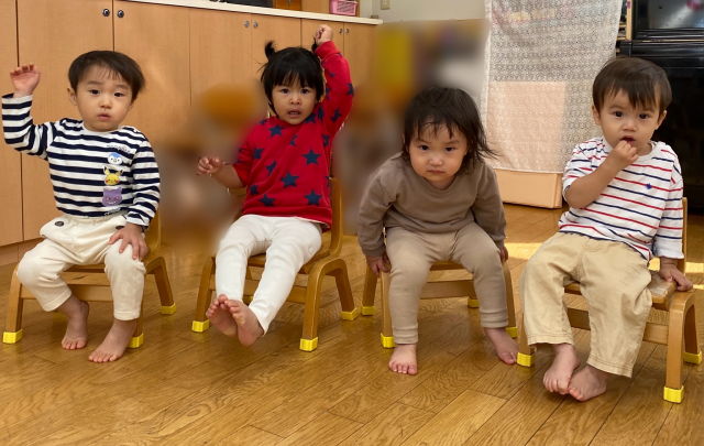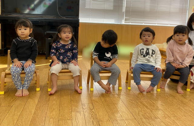 まずは、自分のマークを見つけて椅子に座ります。「◯◯ちゃんのあった!」「ここだよ〜!」と嬉しそうに教え合う姿も見られます♡自分のマークを見つけて座る姿に、少しずつ自立の芽が感じられますね。椅子に座ったら、「手はおひざ〜」「お膝とお膝はくっついているかな?」と座り方を確認します。声かけに合わせて、自分の体を見ながら姿勢を整えることができました。