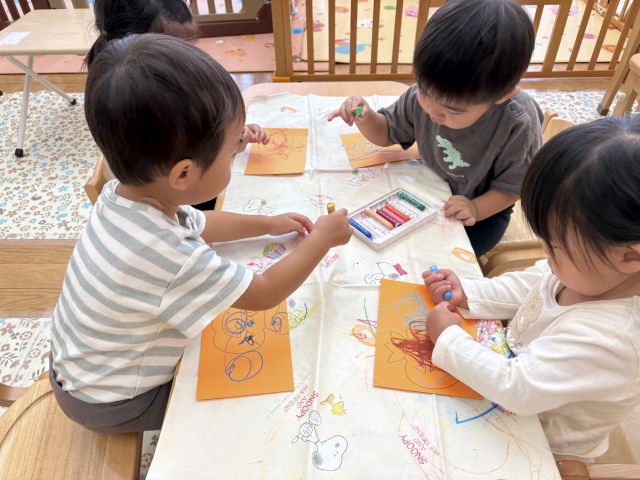 まずは、10月31日のハロウィンパーティーに向けてお面づくりをしました。好きな色のクレヨンでぬりぬり♪