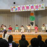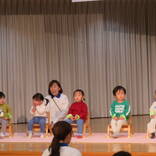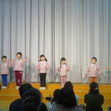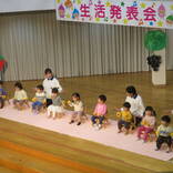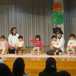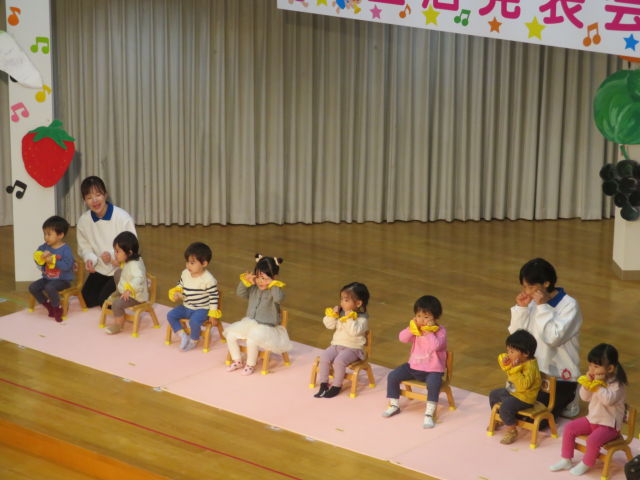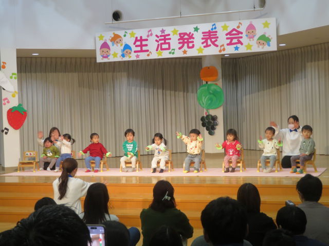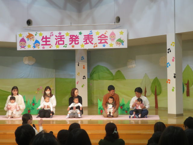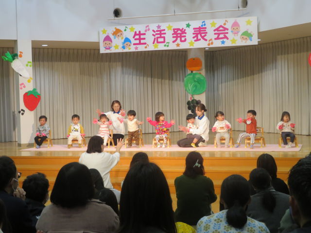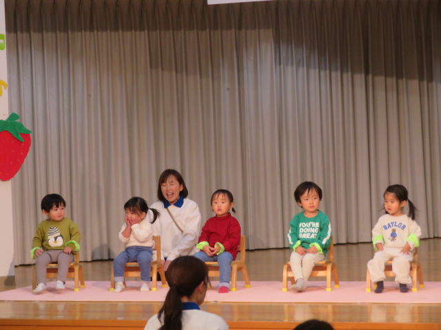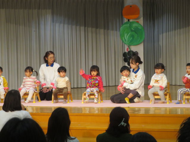 つづいては1歳児たまご組。やさしいお声で返事をしたり、手遊びと歌を披露してくれました。幕が開いて、たくさんのお客さんがいたことにビックリしている姿も見られましたが、素敵な笑顔や可愛らしい姿を見せてくれましたね!
