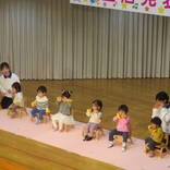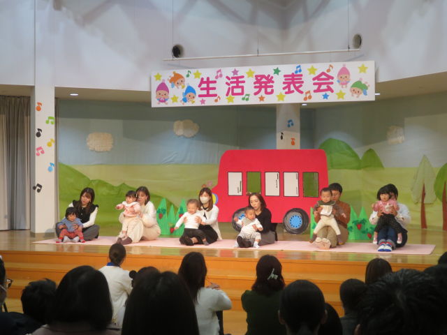 まずは0歳児いちご組の発表です。お家の方と笑顔で入場してくれました。先生の掛け声やバスに乗ってのBGMに合わせて、親子で楽しくふれあい遊びを披露してくれました!