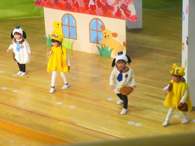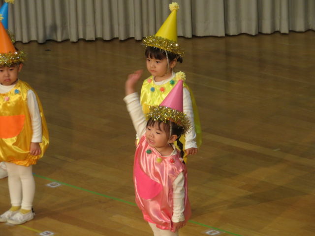 最後は2歳児ひよこ2組。小人に変身して「ふしぎなポケット」を歌ったりダンスをしてくれました。ステージに立つ姿は堂々としていて、かっこよく返事をしてくれましたね。