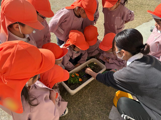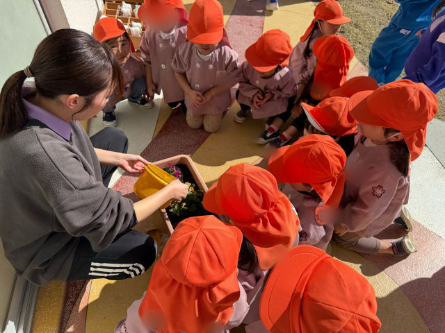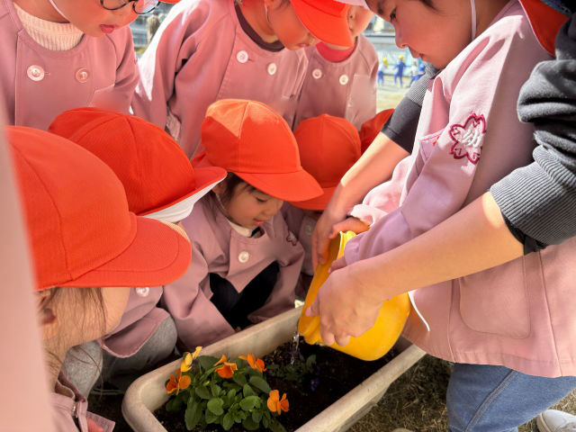 次に園庭へ出て、チューリップの球根を植えました!まずはチューリップを植える場所を作るために、プランターの中の土に穴を掘ります。そこに球根を置き、優しく土の布団をかけていきます!「みんなは喉が渇いたらどうする?」という声かけに、「お水を飲む!!」と答える子どもたち。「チューリップさんにもお水をあげよう!」と、「おおきくなあれ!おおきくなあれ!」と言いながら水をあげました!