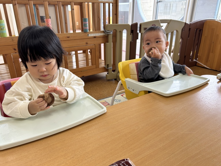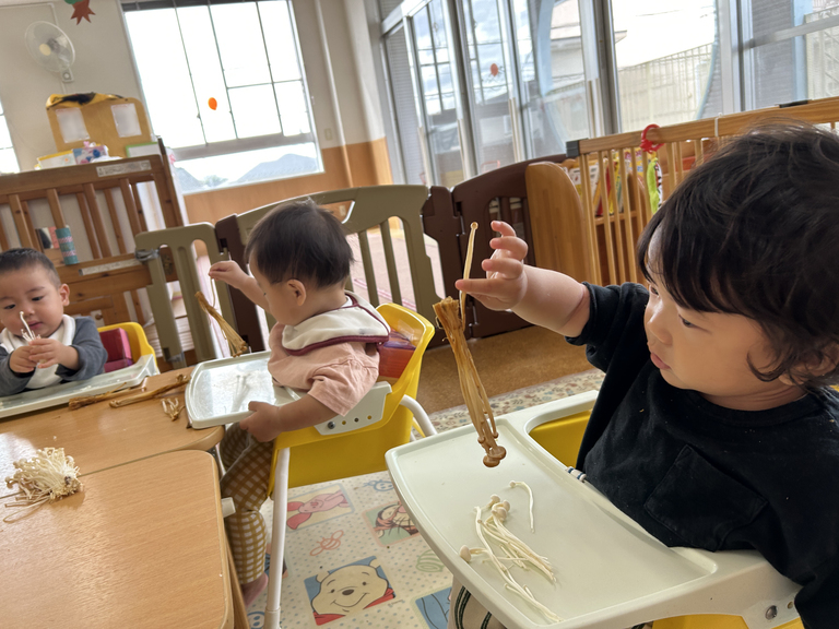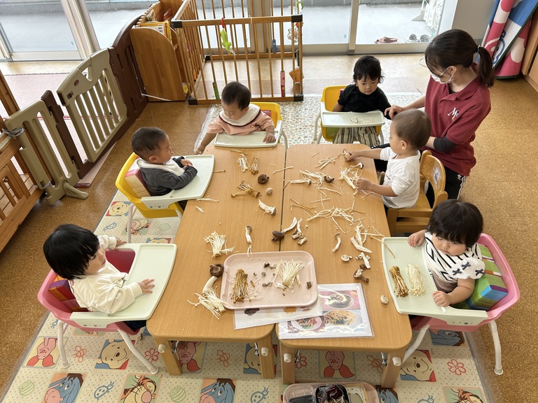 いちご組の子どもたちにいろいろな形があるきのこを見せると、目をまん丸にして「早く触ってみたい!」と手を伸ばしてくれました。指先に力を入れて柔らかい感触のきのこを触ったり、机の上で跳ねるきのこを見てみんなで笑い合ったりして嬉しそうな姿を見せてくれましたよ♪