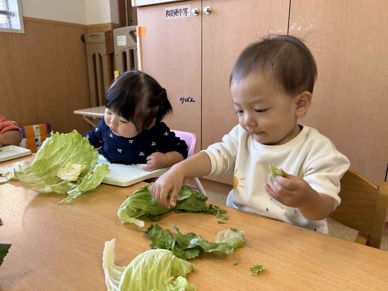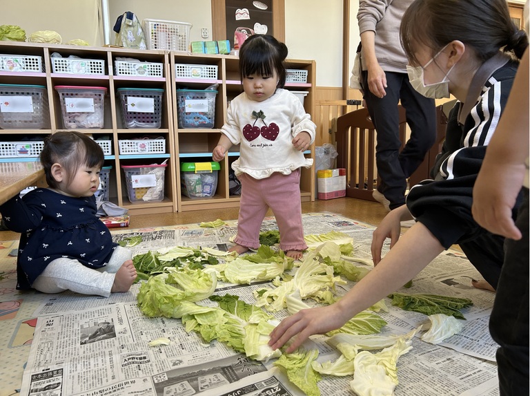 葉茎菜類に位置する3つの野菜を見せると「なんだかどれも似ているなぁ」というような表情を浮かべる子どもたち。一枚一枚葉を取って子どもたちの目の前に置いていくと「ビリビリッ」と破いていきます♪野菜をビリビリできたことが楽しかったようで、細かく千切れるように競い合う場面なんかもありましたよ♡最後に足で踏んでみると、、、、「冷たい!」「気持ち良い!」といった可愛らしい顔で笑顔いっぱい!