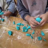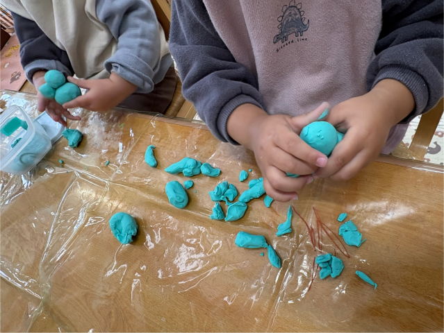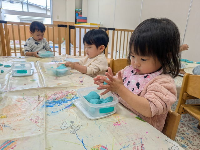 初めての粘土遊びに挑戦しました。最初はおそるおそる触れる子がいましたが、友達の姿を見たり、回数を重ねたり、大好きな動物やキャラクターを作ったりすると少しずつ触れられるようになっていきました!両手で力いっぱい引っ張ってくるくる丸めたり、指先でちぎって小さくこねこねしたり、、、集中して取り組んでいましたよ♪「見て!」と元気な声が聞こえ、覗いてみると「ごはん!」「ブーブ!」と大好きなものを作ったり、できたものを見立てたりして夢中になっていた子どもたちです!