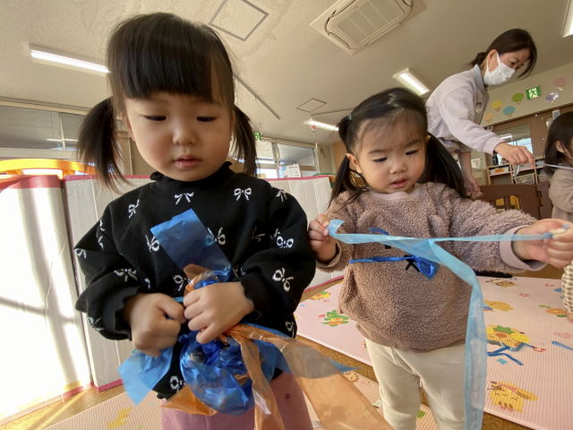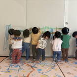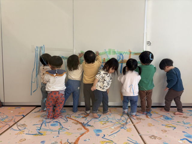 スズランテープをみると「キラキラ!」「あおー!」と興味津々に見つめる子どもたち。手に持つと振って音を確かめたり、ひらひらとなびかせて動きの変化に気づいたりして親しみました。ベルトのようにお腹に巻き付けアンパンマンに変身する姿や、両手でスズランテープを引っ張りながら持って体操ごっこをする姿、海に見立てて魚になりきり泳いだりする姿など想像力を膨らませ、のびのびと楽しんでいました!先生がスズランテープを裂くと、私も!僕も!というように手に持って真剣な表情で指先を使って裂こうとする姿や雨のように降らせる姿も見られましたよ♪壁にテープを張り付けると、落ちているスズランテープを探してペタペタとくっつけます!たくさんくっついたスズランテープをうちわのようなものであおぐと、、、「わあああ!」「くらげみたい!!」とうれしそうな笑顔がこぼれました♡