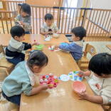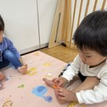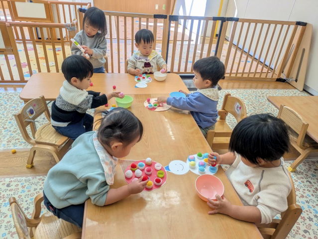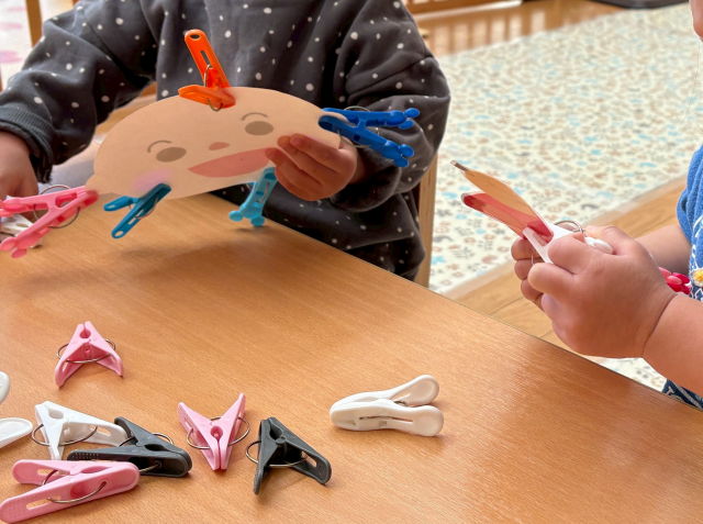 最近、子どもたちの「自分でやりたい!」という気持ちが強くなり、身の回りのことに挑戦する姿が増えてきました。そんなときに大切になる力の1つが、指先の力です。たまご組では、つまんだり、引っ張ったりするなど指先を使った遊びを通して、楽しみながら育んでいます。今回は、その様子を紹介します!