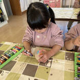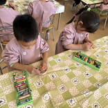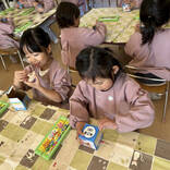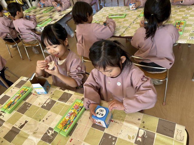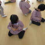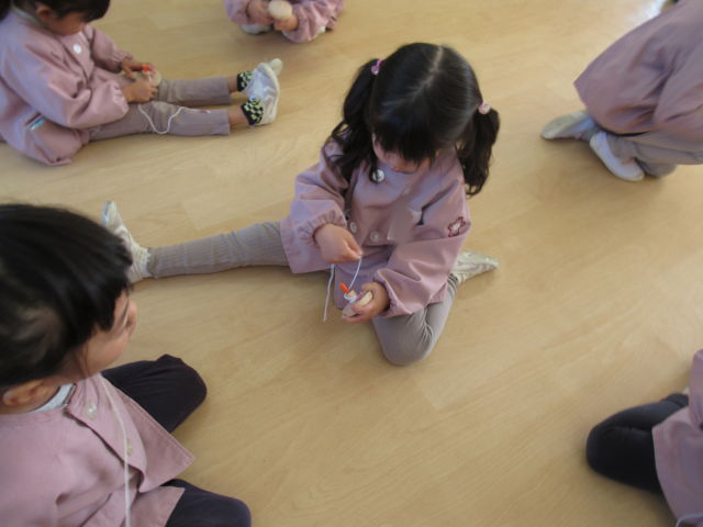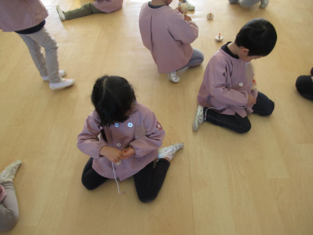 こまが完成したらいよいよこま回しに挑戦です!年少組の時は手で回していましたが、年中組になると紐を使って回すことに!真剣な眼差しで紐を巻く子どもたち。はじめは上手く回すことが出来ずに試行錯誤をしていましたが、コツを掴んだお友だちが次々にこまを回すことに成功しました!やり方をお友だちにも伝授して回せるお友だちがどんどん増えてきました。こまが回ると「みて!みて!回った!」と大喜びをしていました♪「また明日もこましたいな~」と言う程こま遊びが気に入ったようです☆これからたくさん遊ぼうね!