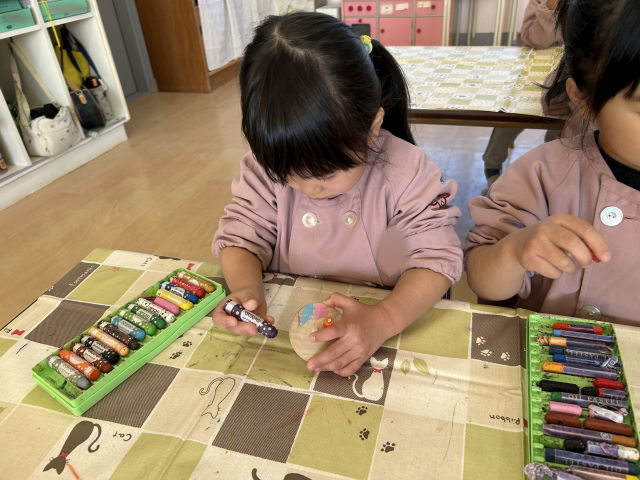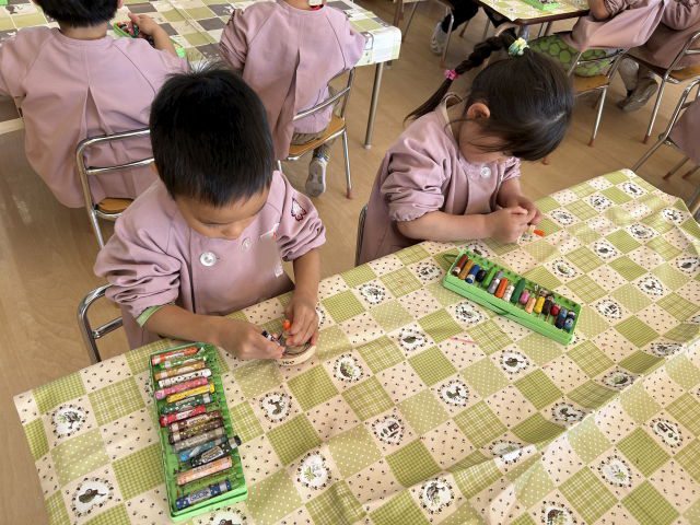 こまをもらったので早速世界に一つのこま作りをしました!クレヨンを使って好きな色で塗ったり、線や模様を描いたり・・「虹色にするの!」「かっこいい色にしたよ!」とそれぞれこだわりを持って素敵なこまが出来上がりました♡