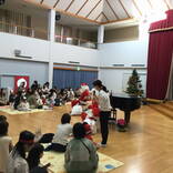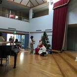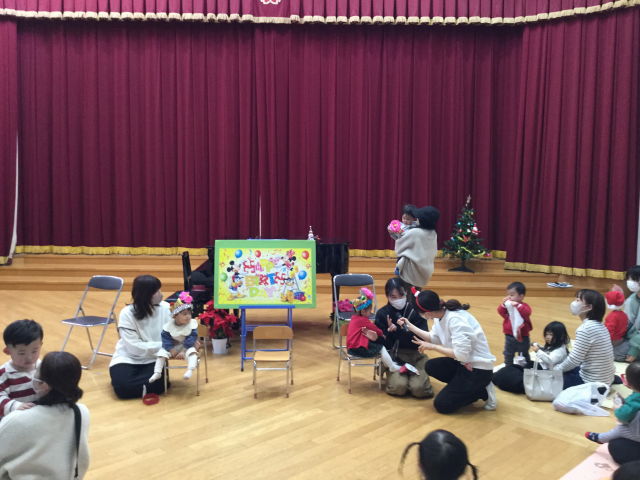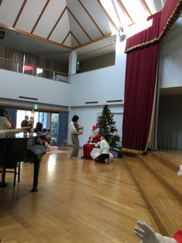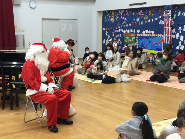 12月生まれのお友達のお誕生会を終えると、「シャンシャンシャン…」鈴の音が聞こえてきました。幕が開くと2人のサンタさんが!!