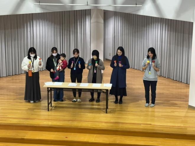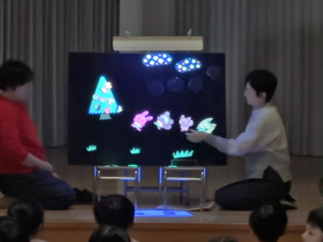 そのあとは、おはなしポケットの保護者の皆さまによるブラックシアターとハンドベル。幻想的な光と優しい音色に、子どもたちは夢中になっていました。