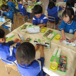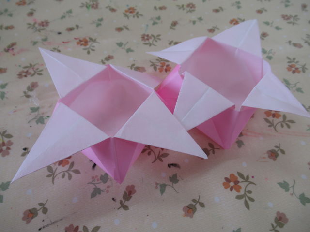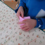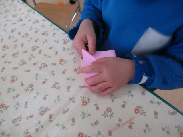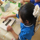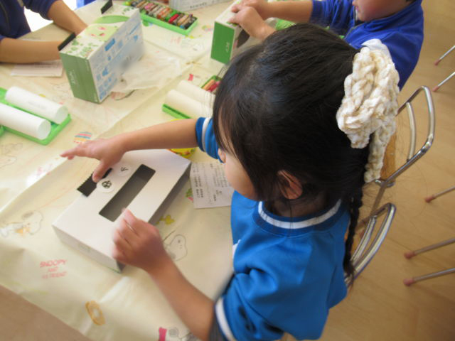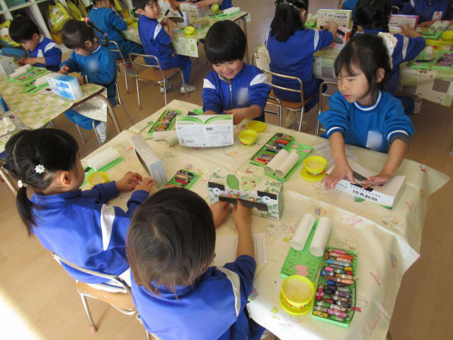 折り紙でつのこうばこも作りました。白いところが見えないように端と端を合わせて折るのが上手になってきた年中組です。少し難しい折り方も保育者の話をしっかり聞きながら挑戦!上手く出来なくても最後まで諦めずに挑戦する姿に成長を感じました!