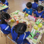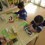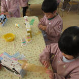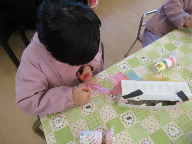 鬼のお面はご家庭から持ってきていただいたティッシュの箱に眉毛・目・ほっぺた・歯を糊でつけました。「怒ってる鬼がいいなぁ」「眉毛はここにしようかな…」と1つひとつの過程をとても丁寧に行っていました。トイレットペーパーの芯は自分の好きなマスキングテープを貼ってカラフルな角が完成!手先が器用になってきたのでマスキングテープを貼るのもスムーズに貼ることができました。仕上げにスズランテープで髪の毛をつけたら素敵な鬼のお面の完成です♡