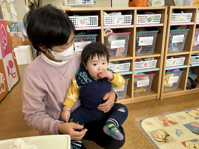 現在のいちご組は9名になりましたが、1人ひとりの個性が徐々に出てきて活発的に活動しています!!自分以外のお友達に興味を示し、高月齢児は低月齢児に玩具を貸してあげることができるようになってきました。他にも、手を洗ってみようとしたり靴下を履いてみようとしたりする姿が多くなってきました!低月齢児はハイハイをして、楽しく保育室内を探索していますよ♡