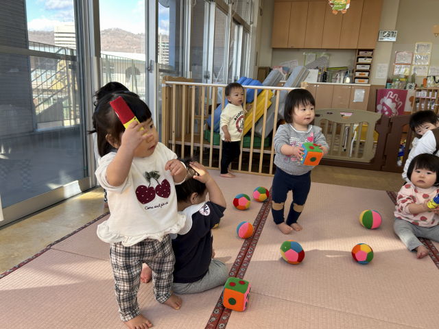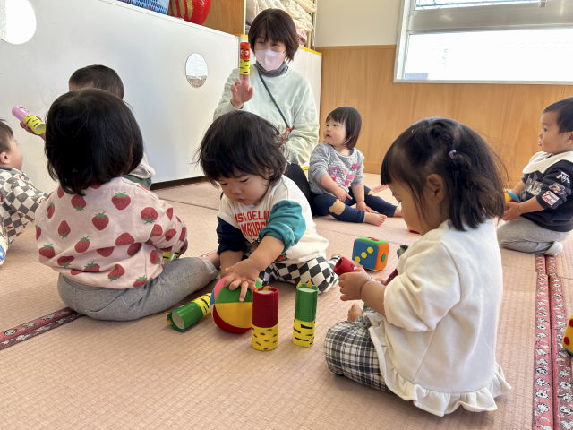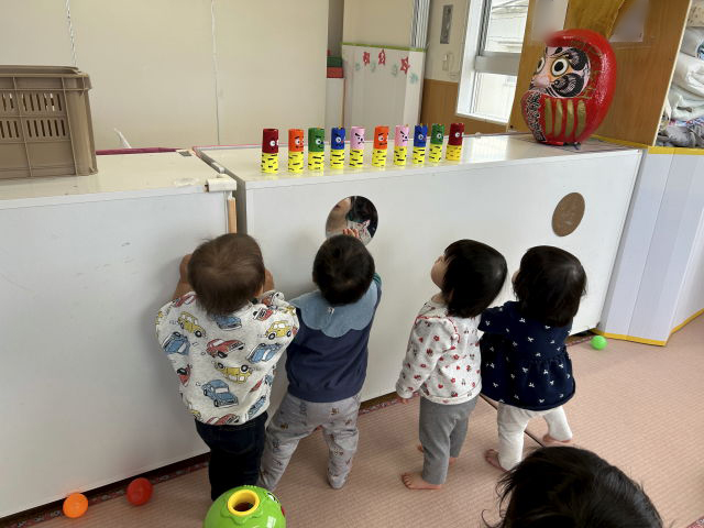 最近では、節分会に向けてトイレットペーパーの芯でできた色とりどりの鬼たちを手に取り、先生と一緒に「まめまき」の歌を歌っています♪「この色の鬼が良い~!」とギュッと握りしめて先生の動きを真似します。子どもたちは手遊び歌を楽しそうにやっていますよ~♡