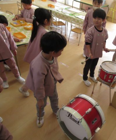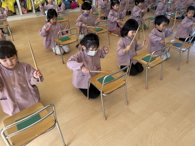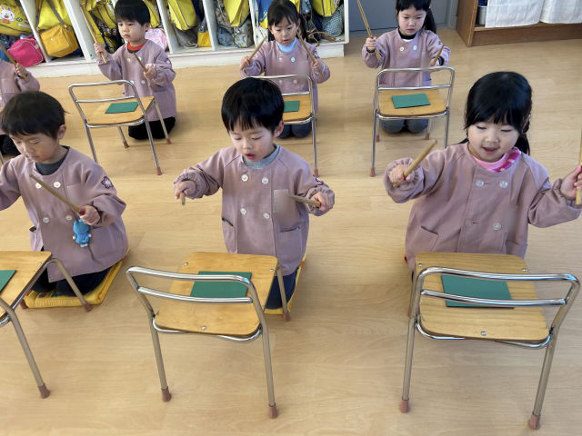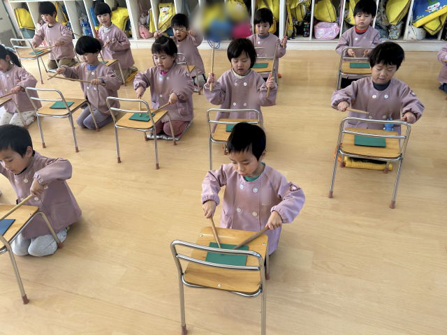 マーチングの基本の叩き方である『タン・ウン・タン・ウン・タンタンタン』のリズムで叩けるように練習しています。最初は「難しい~」と苦戦していましたが、「口で言いながら叩けばいいんじゃない?」と自分達で考えながら練習をする姿が見られました。バチの持ち方もまだまだ練習中です。バチを握る場所や向き、持ち方は親指と人差し指でつまみ、他の指は優しく握ることを練習しています。「マークのある赤いところを握るんだよね」とお友だち同士で確認しながら練習しています。