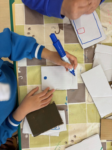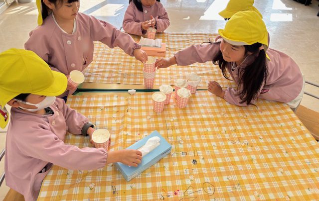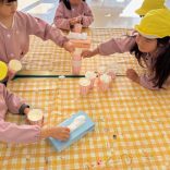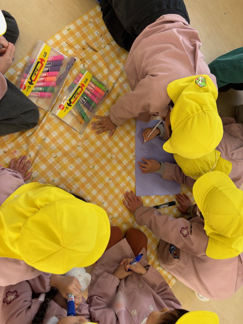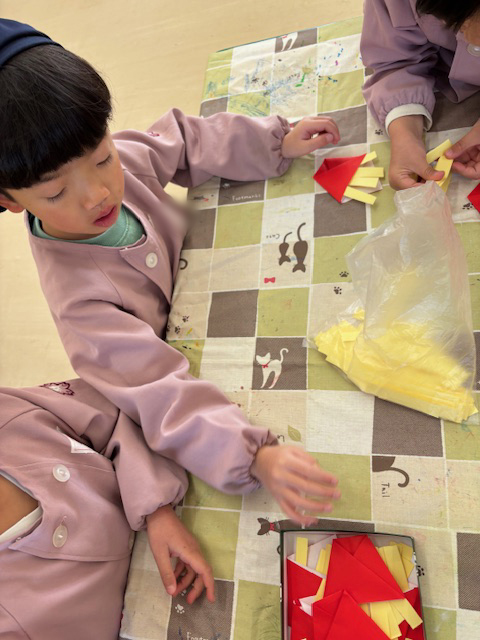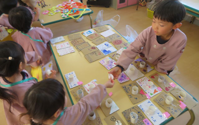 売る品物を作る際も、「お客さんに買ってもらう為に可愛く作らなきゃ!」「これ、お客さんが喜びそう!」と買い手のことを考えながら作す姿がありました。また、お店屋さんの準備の途中でも、「〇〇を作るのを手伝って欲しい」「ゲームチームを手伝った方がいいかも」など、それぞれのチームの進行状況を話し合いながら、お互いに助けあって準備を進めていました。