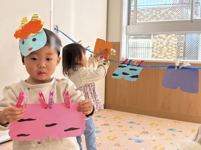 鬼のパンツをお洗濯♪指先を使って上手に干したよ!