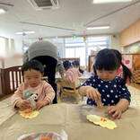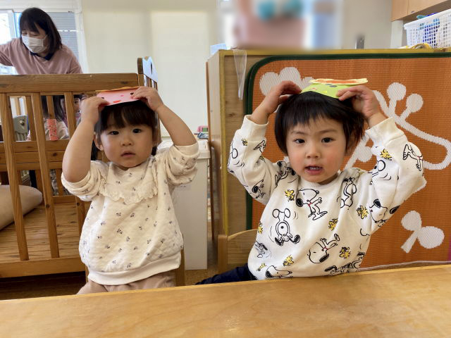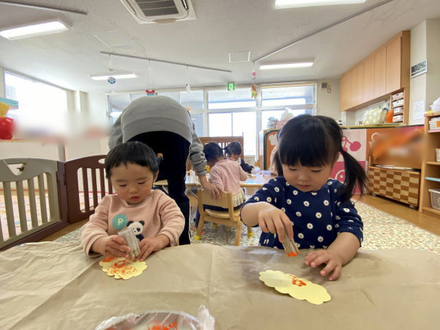 たまご組は、シールや絵の具スタンプを押して、かわいい鬼のお面を作り準備万端で節分会に参加しました。