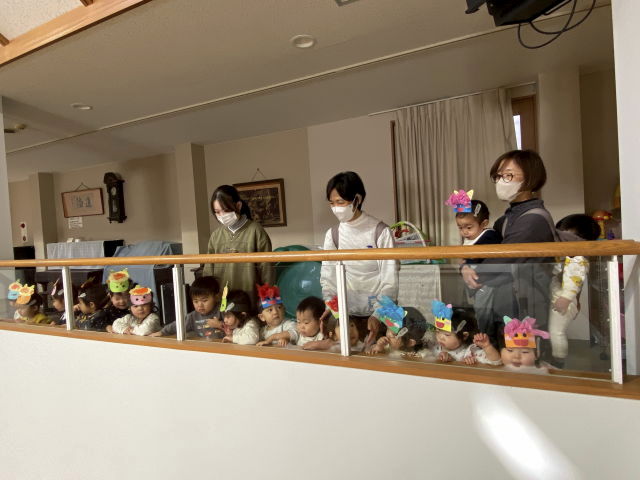 節分会♪かわいいお面を被って、2階からお兄さんお姉さんを応援しました。