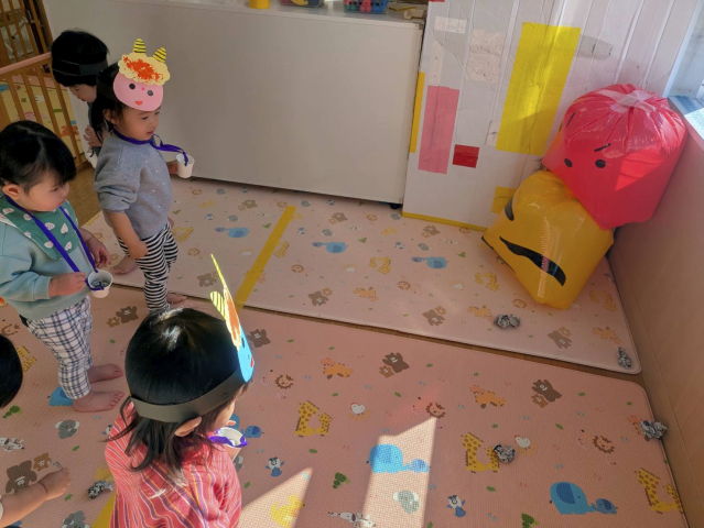 たまご組のお友だちも、新聞紙で作った豆で豆まきをして鬼退治も完了☆今年一年、健康で楽しく過ごせること間違いなしですね♪