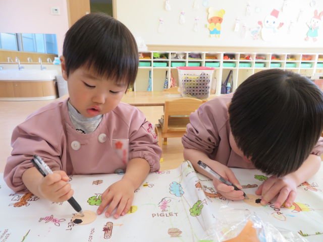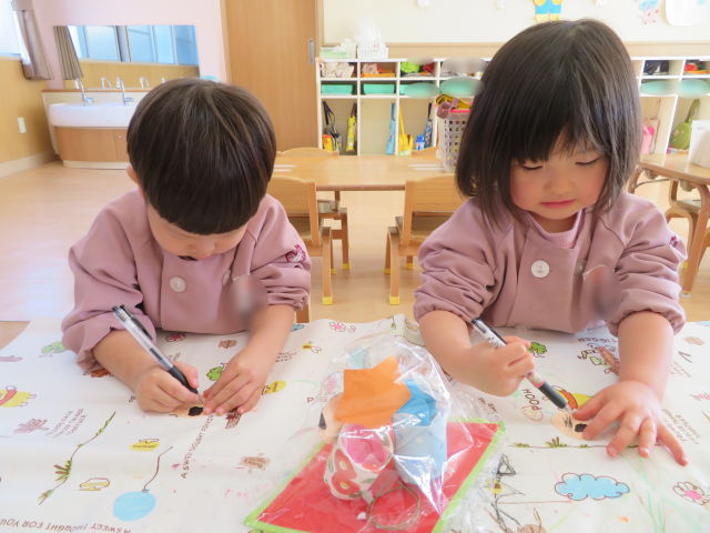 まずは顔作りからスタート!髪の毛の折り紙を顔からはみ出ないように貼り、ボールペンで顔を描きました。普段のクレヨンとは違う描き心地に興味津々で、「ニコニコにする!」「かっこいいお顔!」と表情を考えながら、目や口を上手に描いていました。最後に、おだいりさまには葉っぱ、おひなさまにはハートの冠の飾りをつけて完成です。