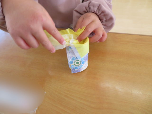 次は着物作りです。好きな柄の折り紙や好きな色のお花紙を自分で選び、トイレットペーパーの芯にくるっと巻き付けました。最初は「どうやるの?」と聞いていた子も、やり方が分かると「できたよ!」と嬉しそうな表情に♡芯の中にお花紙をそっと入れ、扇子と笏を貼ったら完成です。