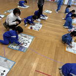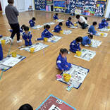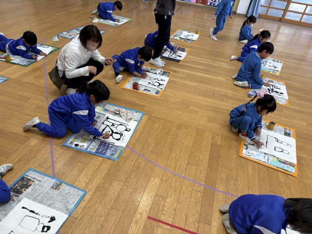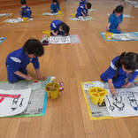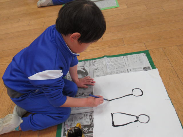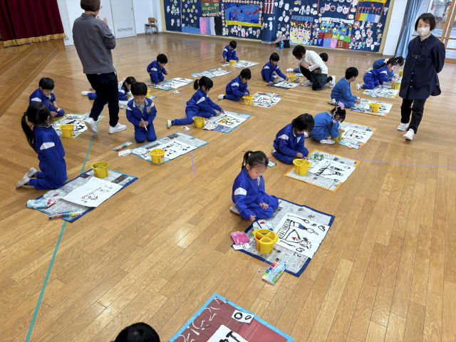 和紙に墨で顔の輪郭や着物を描き、個人用絵の具を使って色付けしました。「ぼんぼりも描かないと!」「桜の花びらも描いたよ♡」と思い思いに描いていました。