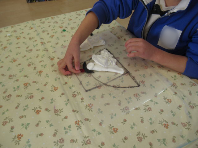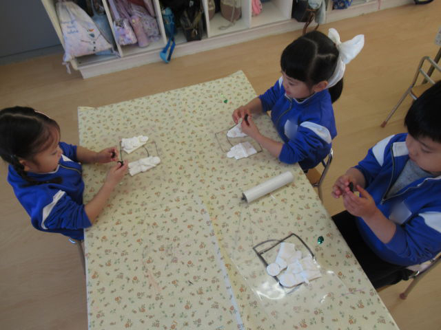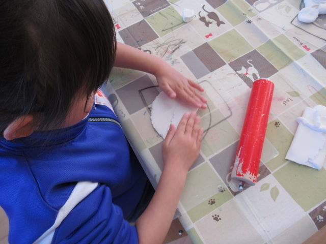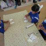 いよいよおひなさま作りの日がやってきました。体操着に着替えて準備万端です!はじめは「難しそうだな~」と言っていた子どもたちでしたが、いざ粘土に触れてみると、「ピザを作ってるみたい!」と楽しみながら粘土を伸ばしていました♪お内裏様の着物は長方形に、おひなさまの着物は丸い形に伸ばすことを教えてもらいました!着物の形ができたら丸い顔の部分や扇子や笏などの小物作りも行いました。