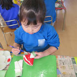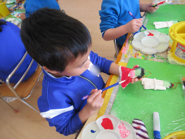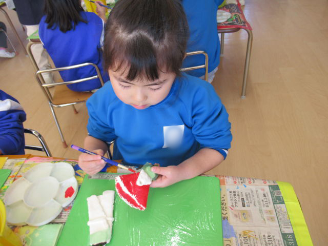 粘土が乾いたらおひなさまの色付けに挑戦です!「何色の着物にするか考えてきた?」という先生の問いかけに、「考えたよ!」「決まってるよ!」とそれぞれが思い思いの色を付けました。おひなさまの顔の部分を持ちながら塗るときれいに塗れるということを教えてもらい、しっかり反対の手も使いながら色塗りに取り組んでいました。「ピンクを作る為には赤と白を混ぜればいいんだね!」「青と白を混ぜたら水色になったよ!」と色を混ぜて自分が使いたい色を作ることにも挑戦しました!着物に模様をつけているお友だちもいました♡