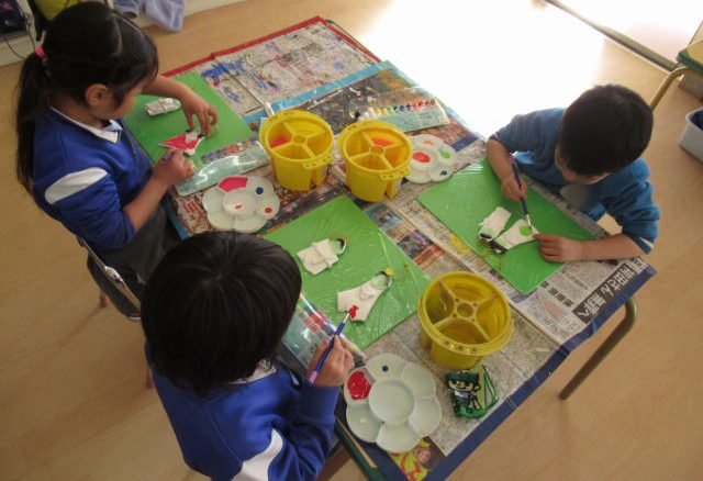 年中組では3学期から個人用絵の具を使い始めました。バケツに水を汲んだり、パレットを持ってきたりと絵の具の準備を自分達で行います。絵の具を混ぜて色を作ったり、筆やパレットの使い方にも慣れてきて、それぞれ好きな色を使って丁寧に色を付けていました。