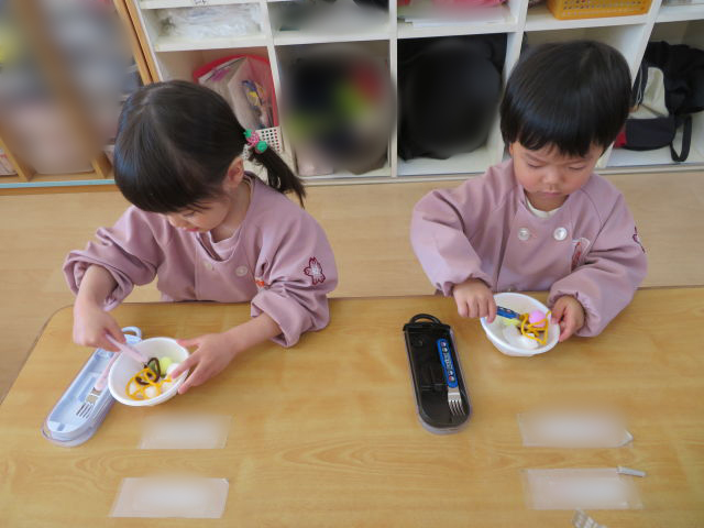 この時に、スプーンやフォークは1つ使ったらおはしセットの中に戻すというお約束もしました。お約束を守り、使ったらちゃんとおはしセットに戻せていました!