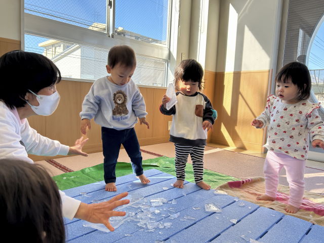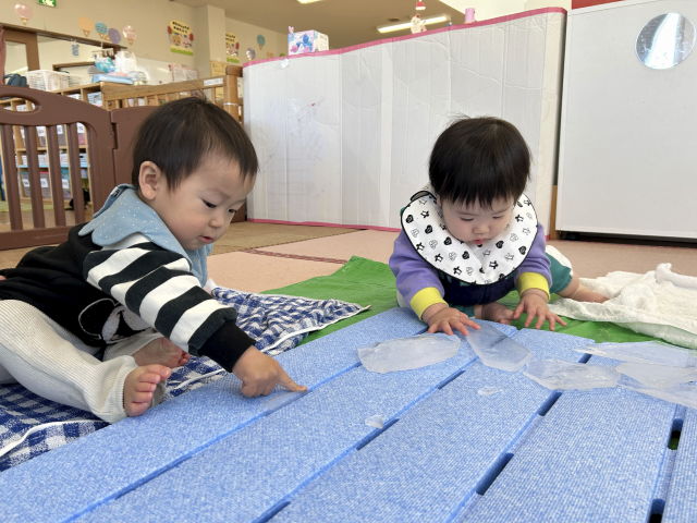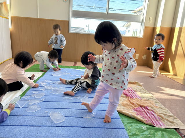 寒い日に保育室外のベランダに水を張っておくと、氷が出来上がっていました♪その氷を子どもたちに見せると驚きの表情や興味津々の様子が見られました。
