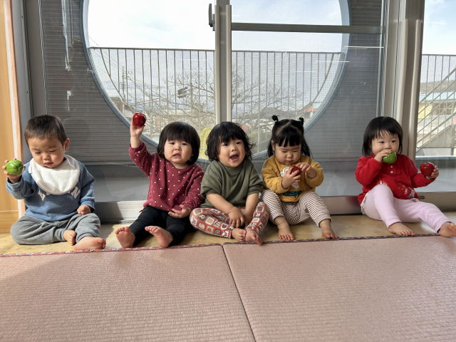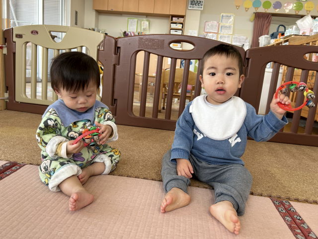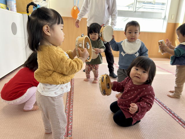 たまご組さんが楽器遊びをしていたので、いちご組も面白そうな楽器を借りて遊んでみましたよ♡高月齢児は窓際に集まって自分たちで楽しく「シャカシャカッ」とフルーツのマラカスを鳴らします。低月齢児は高月齢児の様子を見ながら、鈴に手を伸ばして「これは何だろう?」と振っていました。その様子を見て高月齢児は近くに寄り、どうやって音が鳴るかお手本を見せてくれましたよ♡タンバリンでは、振ったり叩いたりして手遊び歌に合わせて先生と身体を動かしました♪色々な音が鳴った不思議な気持ちと楽しい気持ちを感じられたかな??