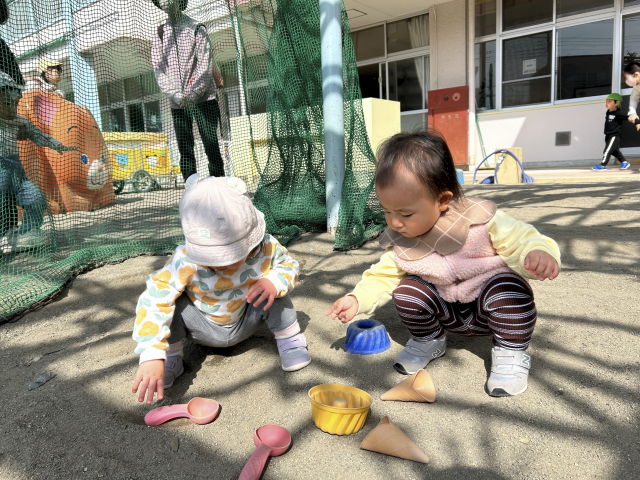 砂遊びや音の鳴る玩具、外で使う遊具などに興味を持って自分から積極的に遊びに参加しています♪